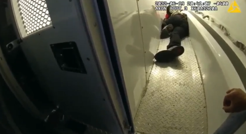 Video of Cox’s arrest shows a handcuffed Cox sitting on a long bench in a police transport van that had no seat belts. When the driver of the van braked hard, Cox slid down the bench head-first into the back wall of the van.