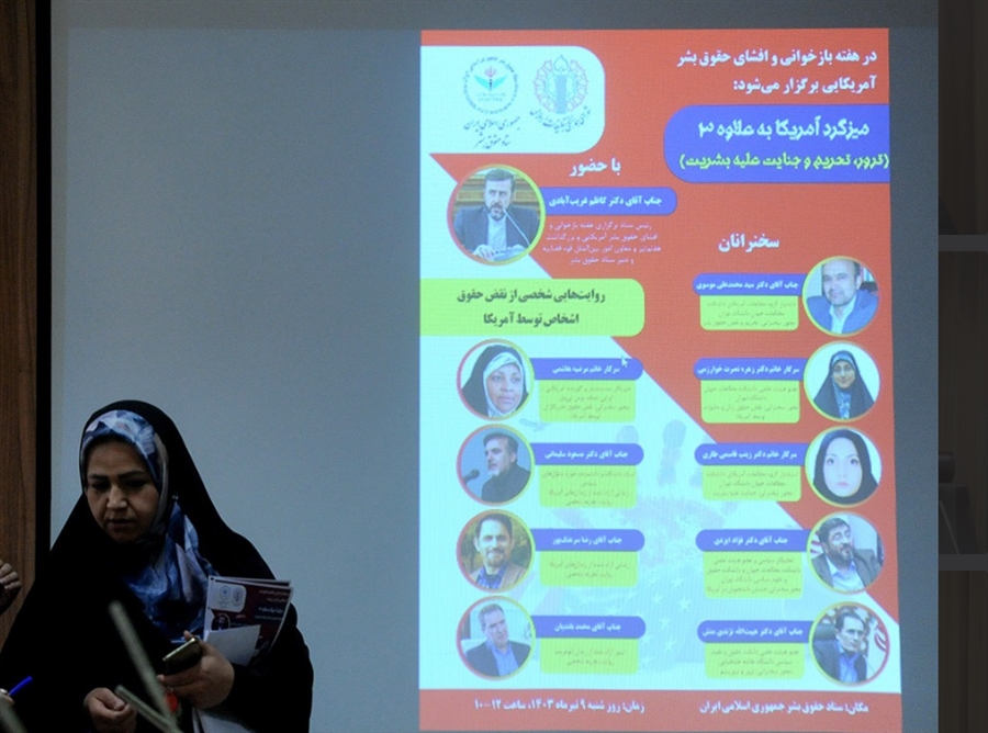 میزگرد آمریکا به علاوه سه؛ "ترور، تحریم و جنایت علیه بشریت" در هفته بازخوانی و افشای حقوق بشر آمریکایی امروز شنبه، نهم تیر ۱۴۰۳، با حضور «کاظم غریبآبادی»، معاون امور بینالملل قوه قضاییه و دبیر ستاد حقوق بشر و جمعی از اساتید دانشگاه و اتباع ایرانی آزاد شده از زندانهای آمریکا در محل ستاد حقوق بشر برگزار شد.
