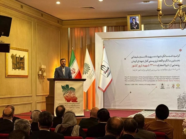 مراسم گرامیداشت شهادت سپهبد شهید قاسم سلیمانی و نخستین سالگرد واقعه تروریستی گلزار شهدای کرمان با حضور کاظم غریبآبادی، معاون امور بینالملل و حقوقی وزارت امور خارجه و سرپرست معاونت امور بین الملل قوه قضائیه و ستاد حقوق بشر، دبیرکل بنیاد هابیلیان، معاون هماهنگکننده نیروی قدس سپاه و نماینده ولی فقیه در بنیاد شهید و سفیران خارجی چهارشنبه، امروز چهارشنبه (۱۲ دی ۱۴۰۳) در مرکز مطالعات سیاسی و بینالمللی وزارت امور خارجه برگزار شد. در حاشیه این نشست رونمایی از دایرهالمعارف ۲۳ هزار شهید ترور کشور و نمایشگاه عکس حمایت دولتهای غربی از گروههای تروریستی ضد ایرانی برگزار شد.