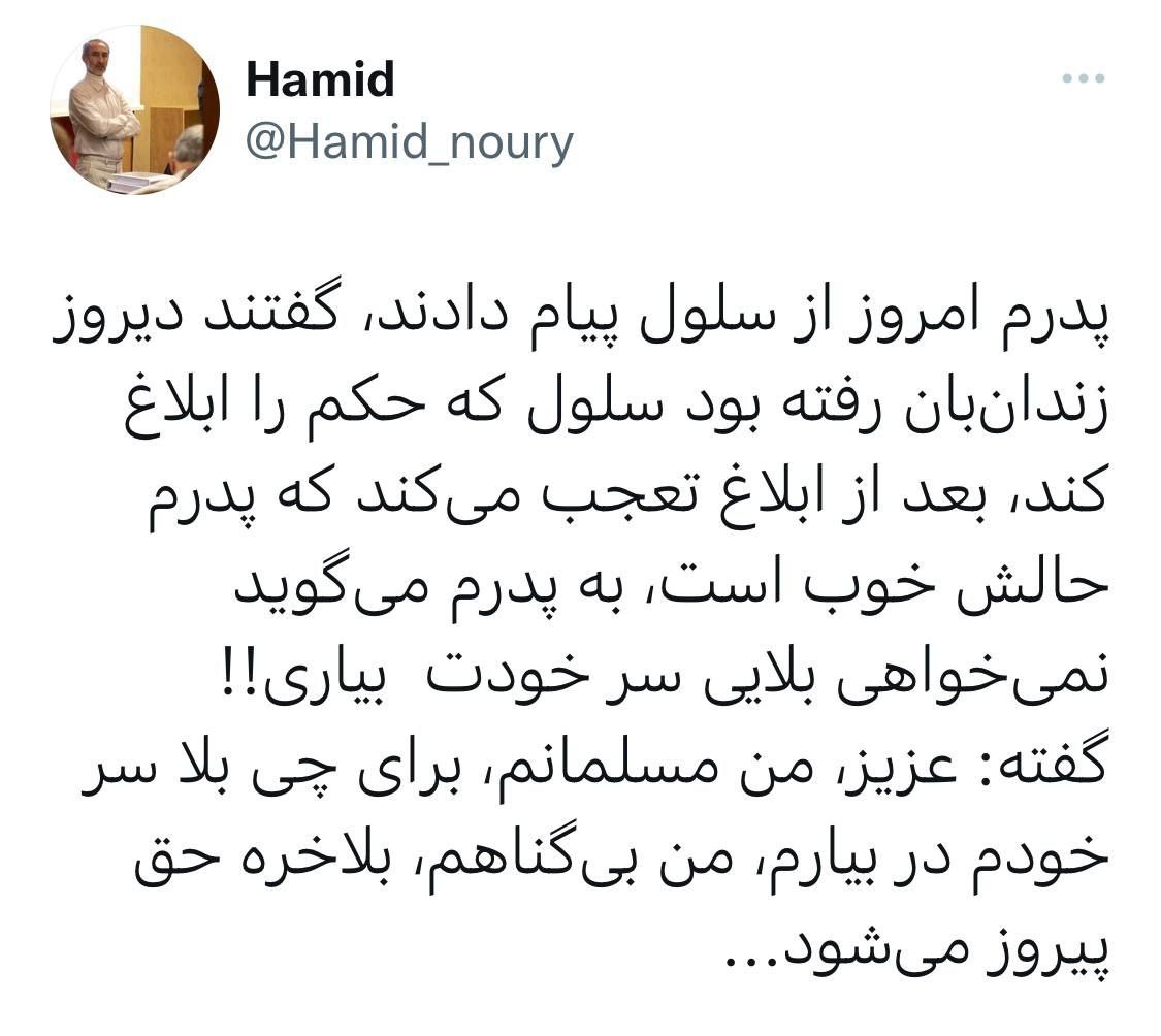 به گزارش مدیریت ارتباطات و اطلاع رسانی معاونت امور بین الملل قوه قضائیه و ستاد حقوق بشر، ستاد حقوق بشر، مجید نوری، فرزند حمید نوری در پیامی توییتری از آخرین وضعیت پدرش خبر داد.