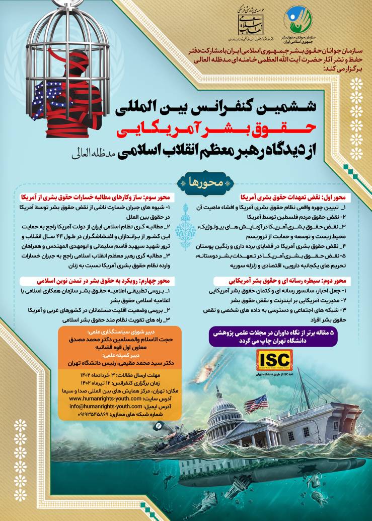 به گزارش مدیریت ارتباطات و اطلاع رسانی معاونت امور بین الملل قوه قضائیه و ستاد حقوق بشر، امین انصاری دبیرکل سازمان جوانان حقوق بشر جمهوری اسلامی ایران از برگزاری ششمین کنفرانس بین المللی حقوق بشر آمریکایی از دیدگاه رهبر معظم انقلاب اسلامی در تهران خبر داد و گفت: رهبر معظم انقلاب اسلامی هفته دوم تیرماه را به نام هفته حقوق بشر آمریکایی معرفی کردند و خواستند که همه قلم به دستان، همه انسان های منصف، آزاده و انسان های انقلابی این مسئله حقوق بشر را روشن کنند و اجازه ندهند که این مسئله توسط یک کشور خاص مورد سوء استفاده قرار بگیرد.