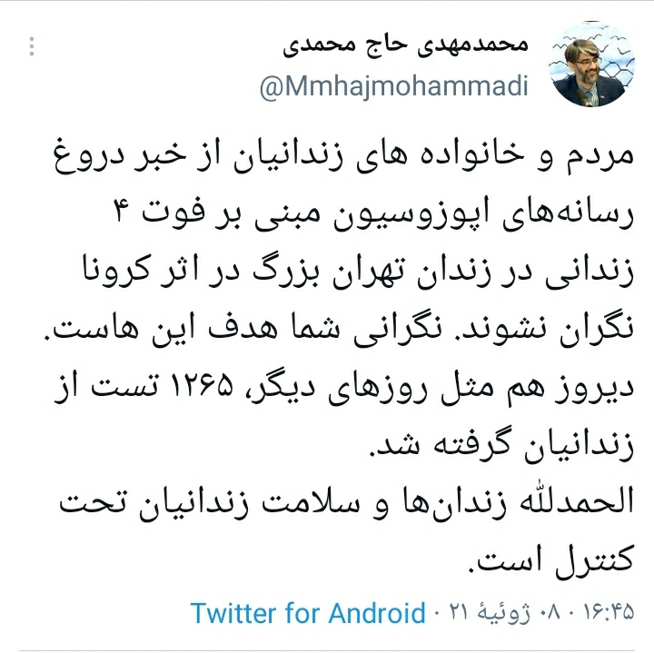 مردم و خانوادههای زندانیان از خبر دروغ رسانههای اپوزیسیون مبنی بر فوت ۴ زندانی در زندان تهران بزرگ در اثر کرونا نگران نشوند. نگرانی شما هدف این هاست.